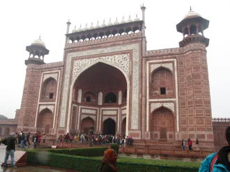 We left Delhi at about 9 a.m. and arrived at our hotel in Agra at about 12:30. The drive offered the excitement of dodging cows, trucks, and so forth outside of the city, where traffic moved a lot quicker. It was misty and sometimes we had rain; we were anxious about whether it would rain when we visited the Taj Mahal.